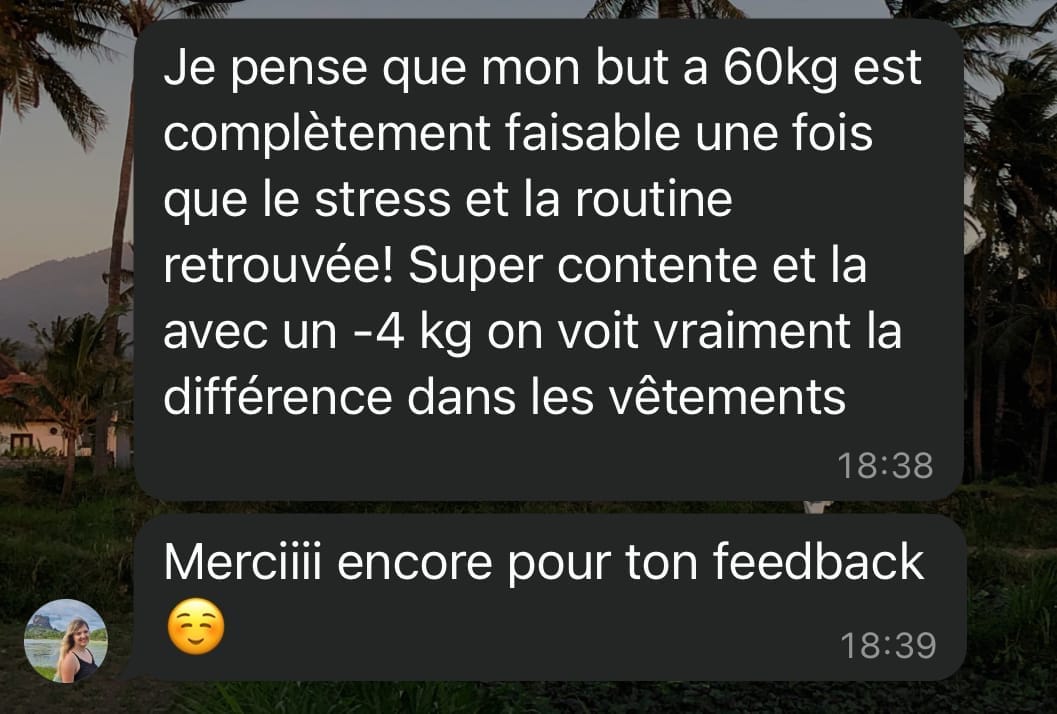 Ça dépend de là où tu pars et les objectifs que tu souhaites atteindre. Notre stratégie va s'adapter à toi pour atteindre les changements que tu souhaites et surtout pour pouvoir les stabiliser sur le long terme. Le mieux est de voir ça ensemble lors d'un appel pour faire le point !