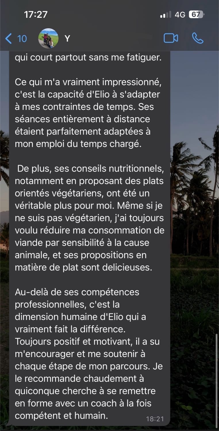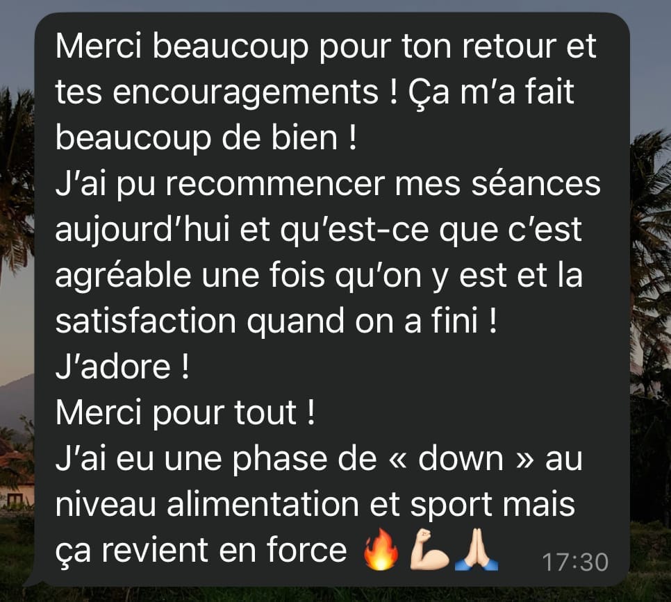 Tu n’es jamais seul dans le processus. Tu es accompagné par un coach qui te soutient, te corrige, t’écoute et t’encourage. Le suivi est humain et 100% personnalisé : nous restons disponibles, nous ajustons ton programme selon ton évolution et nous restons à tes côtés quand tu doutes, comme lorsque tu progresses. Avoir un soutient professionnel et cadré te permet de rester motivé.e, tu as enfin de la clarté, tu gagnes en confiance, et tu vas au bout de ta transformation. Nous ne proposons pas seulement une transformation physique, mais l'implémentation d'un mode de vie sain et durable, la seule approche qui fonctionne réellement sur le long terme.